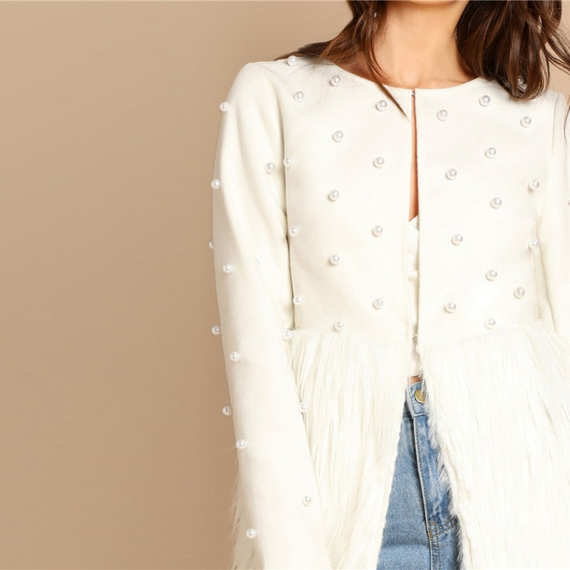White Jacket with pearls embellished and Fur on the bottom.