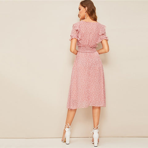 Pink dress with white dots, Vintage style with ruffle trim.
