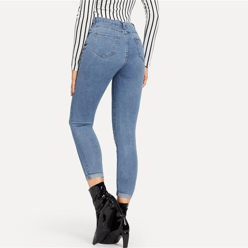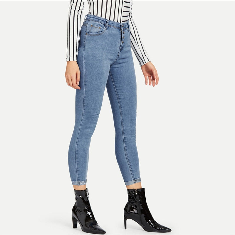 Blue Jeans with a buttoned front design, Available in two slightly different colours.