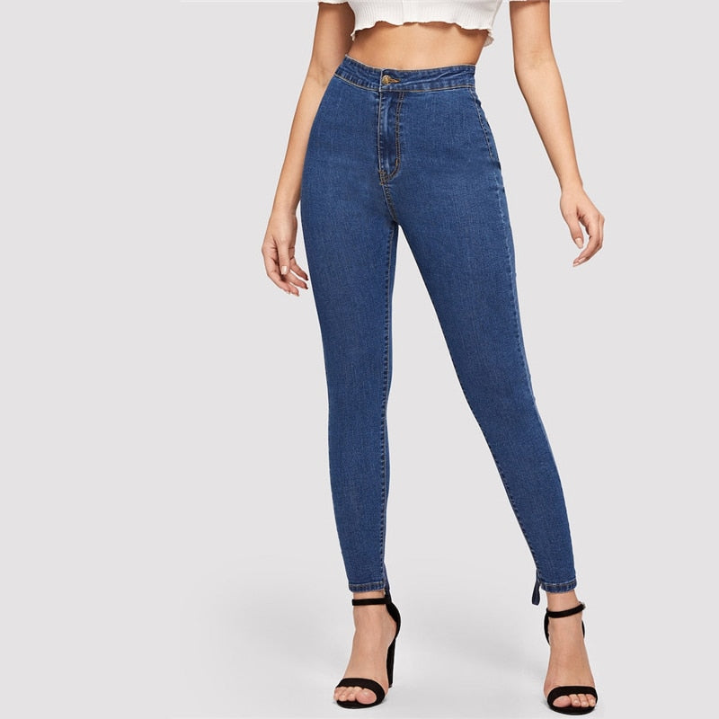 Blue High Waist Skinny Jeans With laces at bottom of calf, Designed in a crisscross pattern.