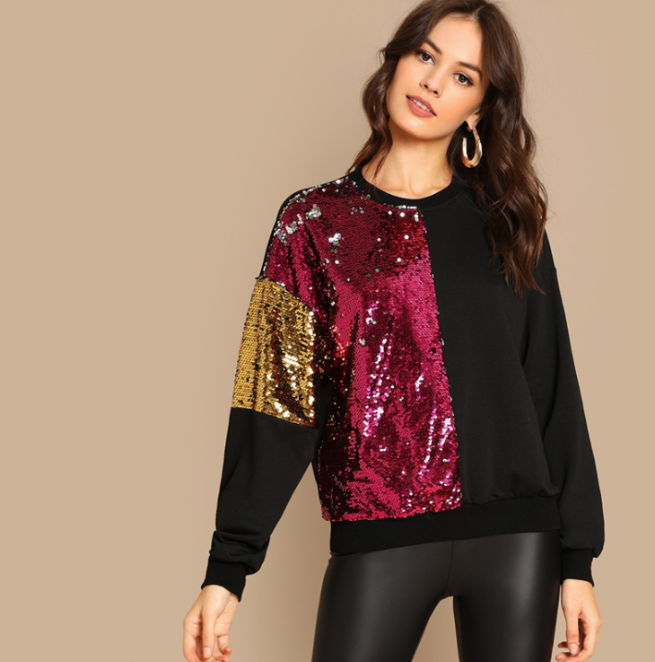 Black pullover sweatshirt with colour blocked sequins over half of the sweatshirt.