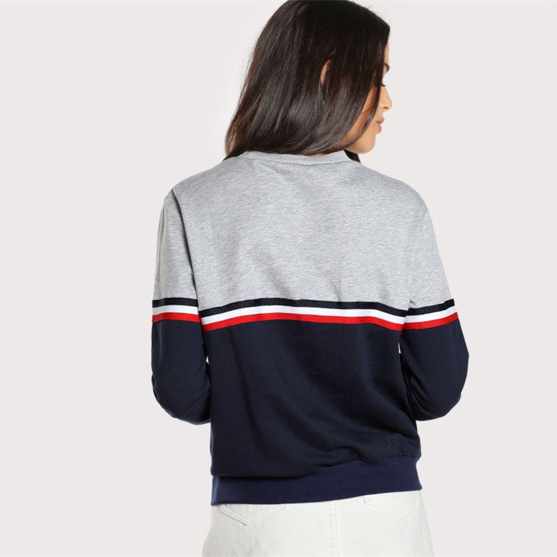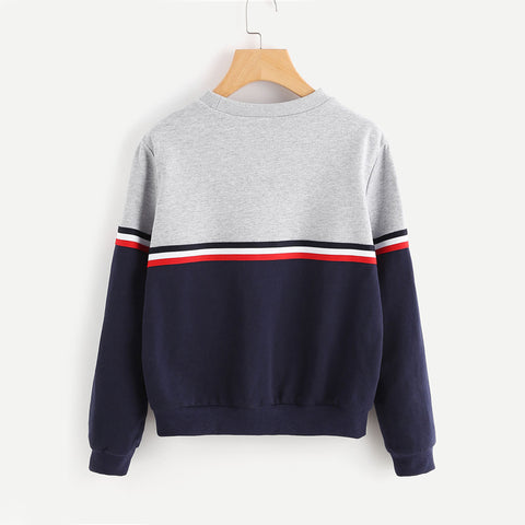 Grey and Navy pullover Sweatshirt with a stripe through the middle horizontally.